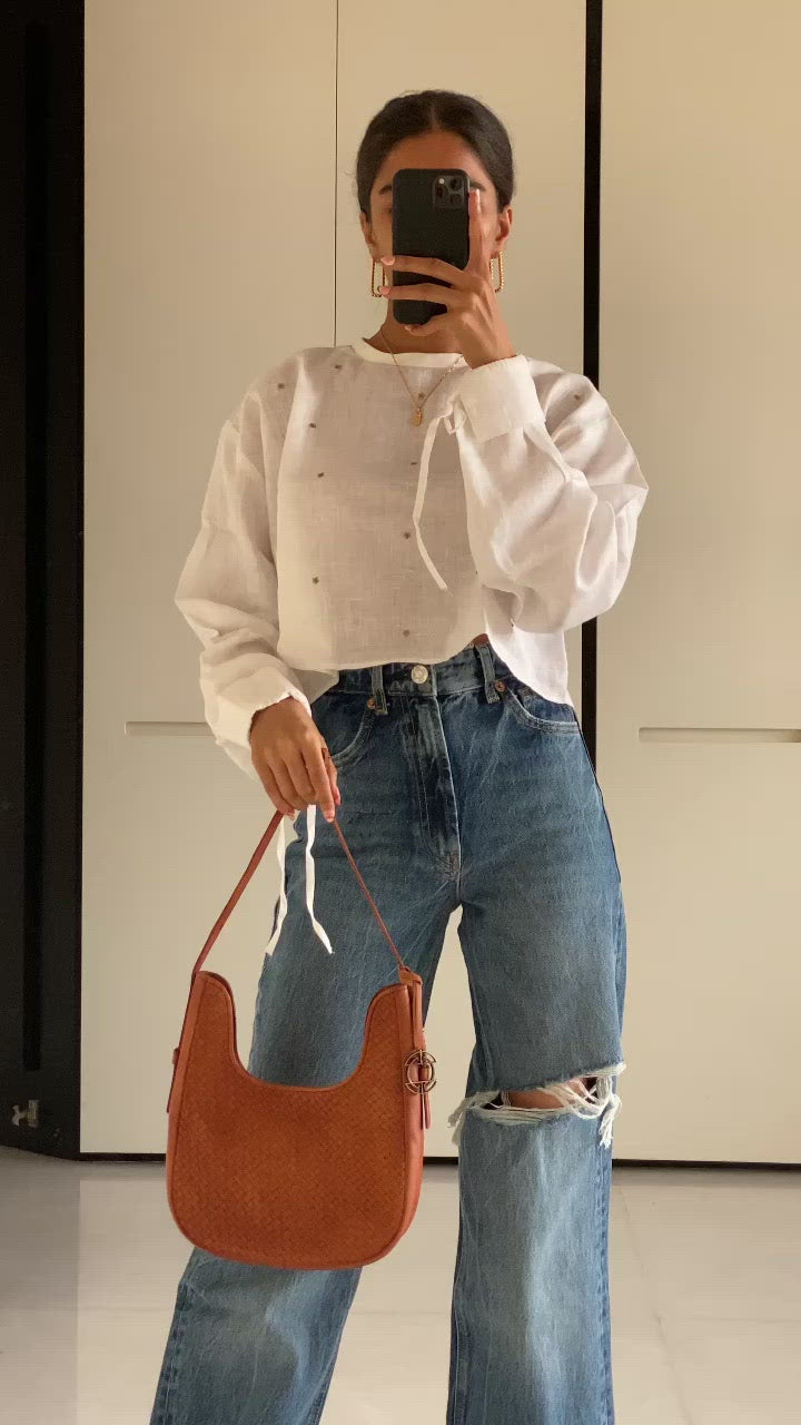 The sleeves have tie-ups at the cuff. Tie them or leave them loose; let your mood decide. For the final flourish, metallic flowers in dull gold add the right dash of whimsy to this unique top.